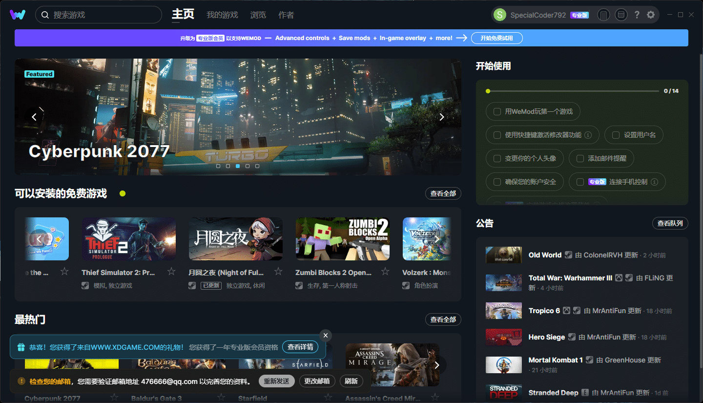 《Wand / WeMod》是国外非常流行的游戏作弊器平台,对各个修改器作者的资源进行整合,只需要搜索就可以快捷获取你想要游戏的修改器,软件自带简中翻译没有使用门槛,注册任意账号登录即可解锁专业版会员付费功能!