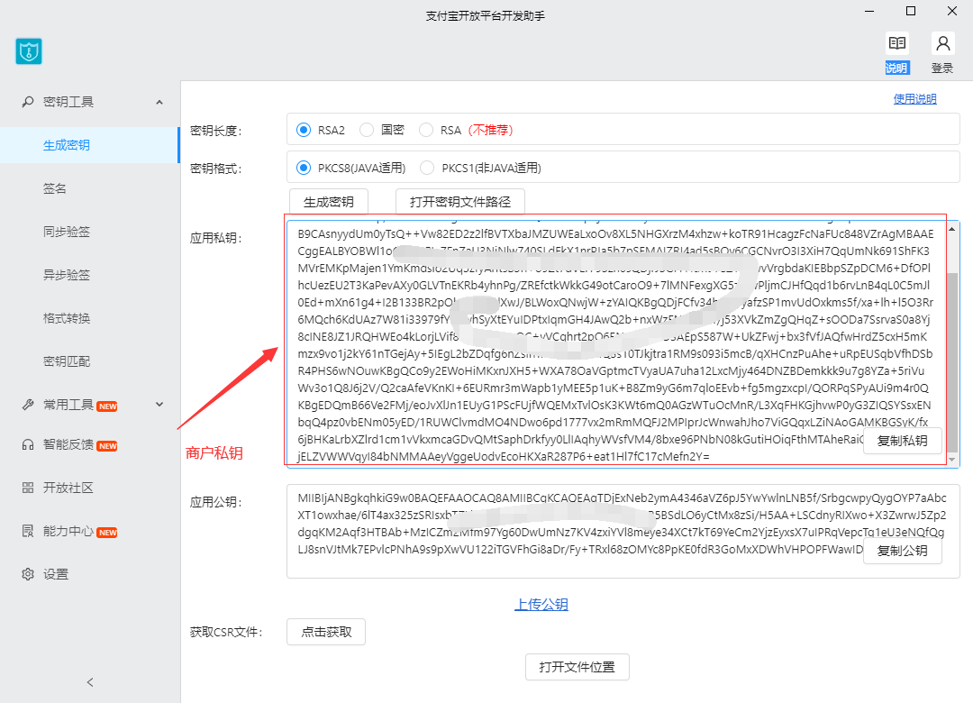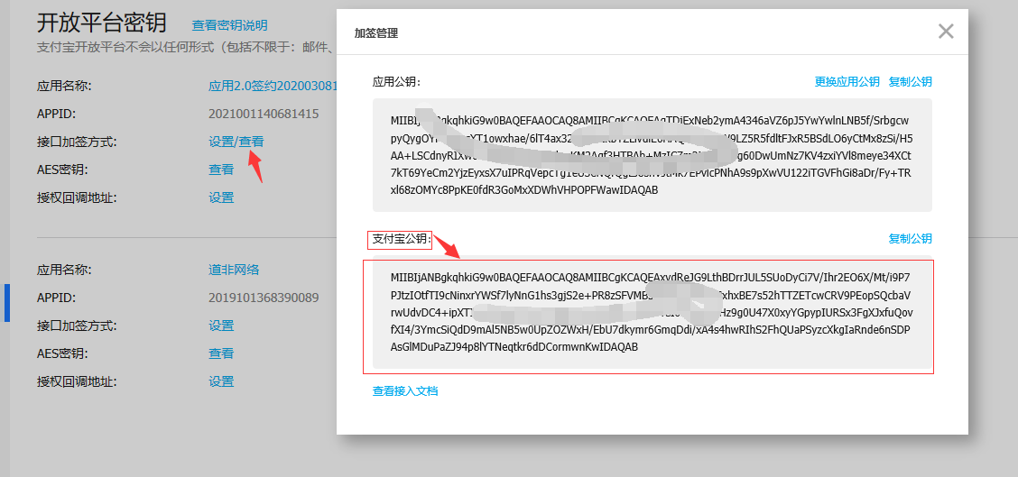 商户私钥就是那个软件里面的应用私钥,支付宝公钥等刷新完成后在打开接口加签方式旁边那个设置/查看,上面那个就是支付宝公钥了