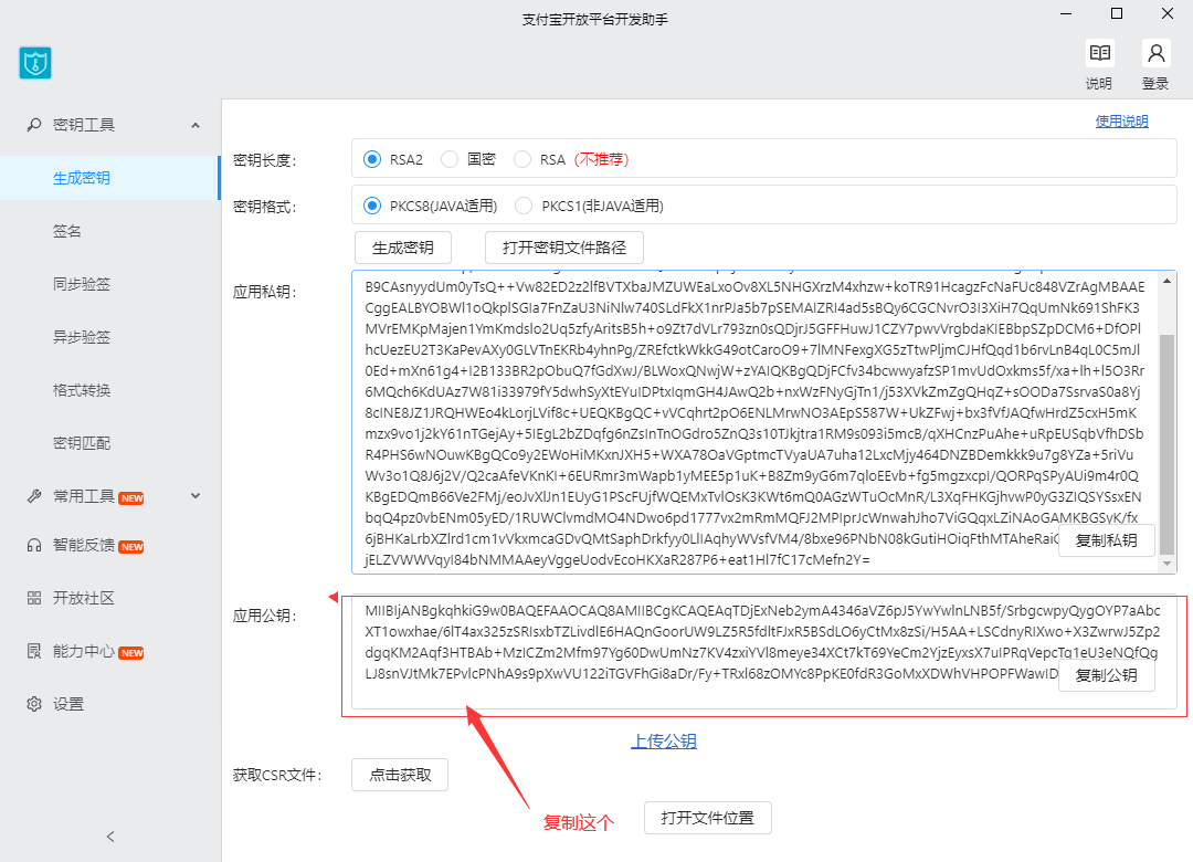 打开后直接点生成密钥,然后复制软件里面的应用公钥到刚刚网站打开那个加签管理的公钥里面,然后保存设置等待自动刷新
