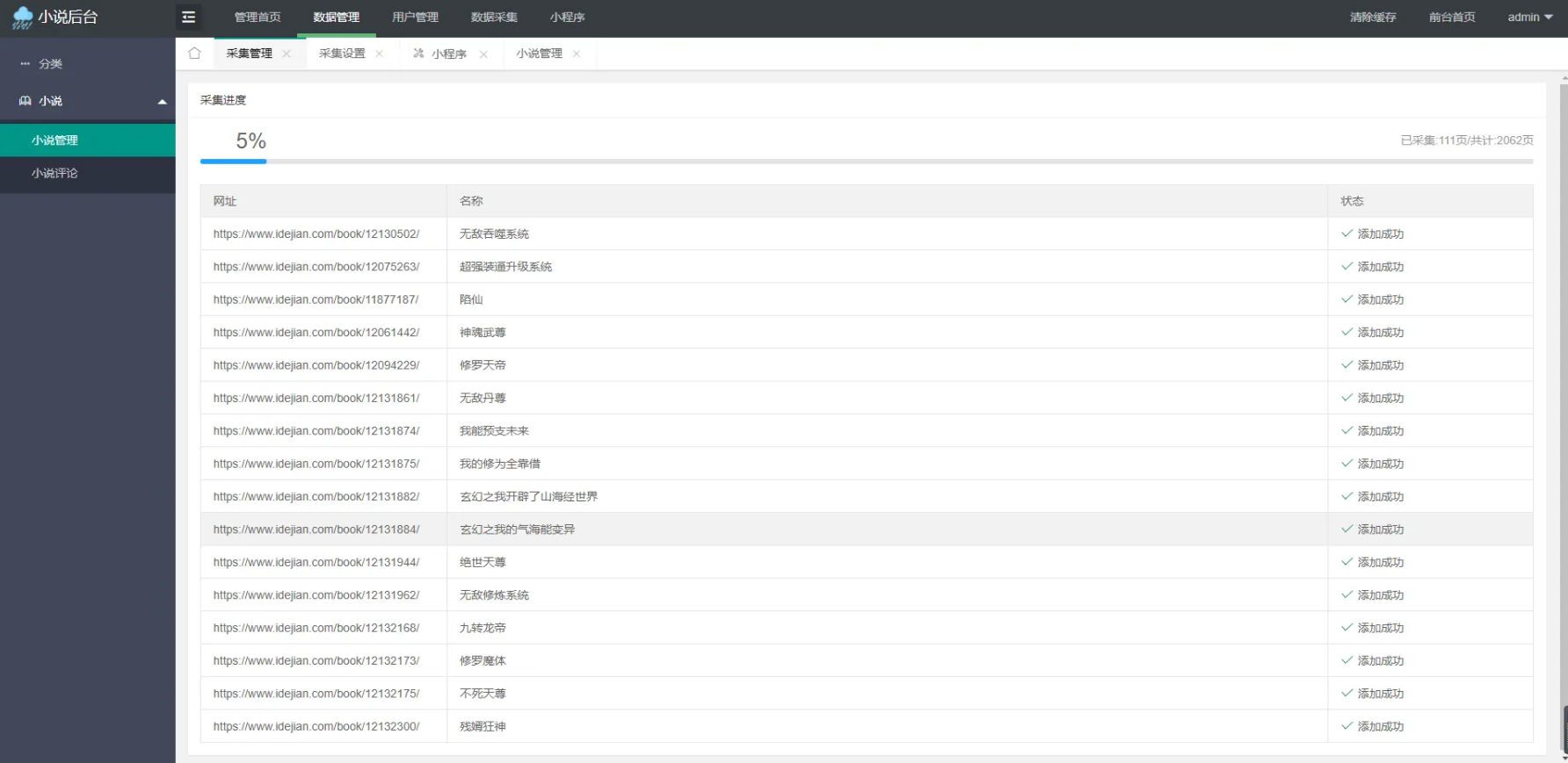 显示点击数据管理然后点击小说管理