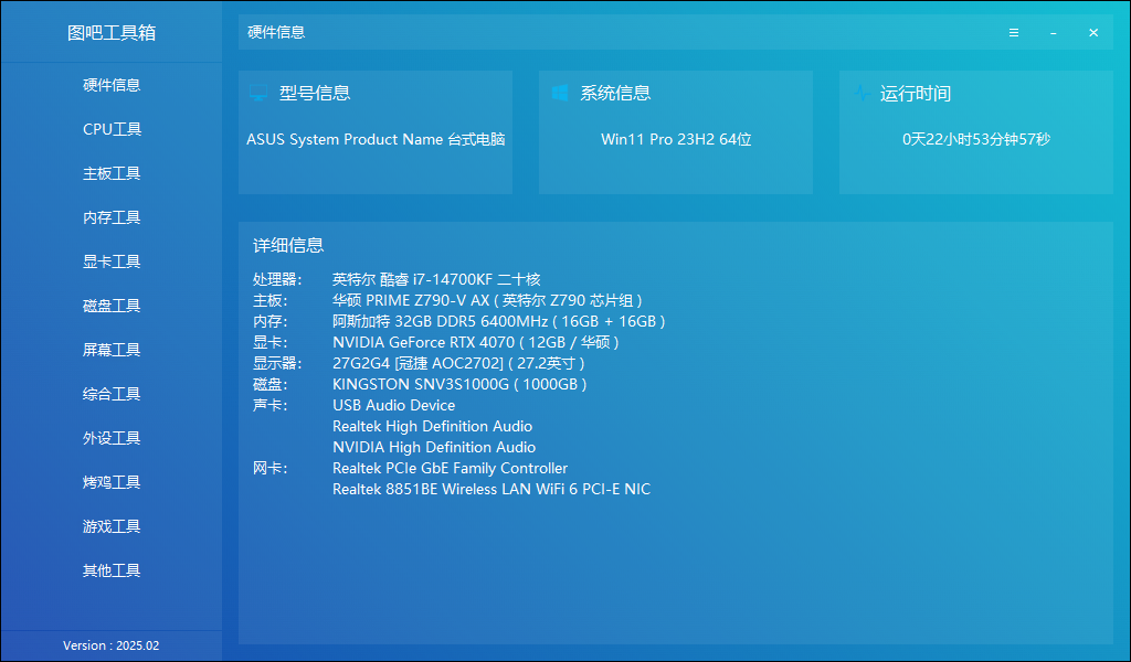 工具箱收集的硬件信息均来自SMBios、WMI、CPUID,数据仅供参考,并不保证一定准确,请以实物为准。